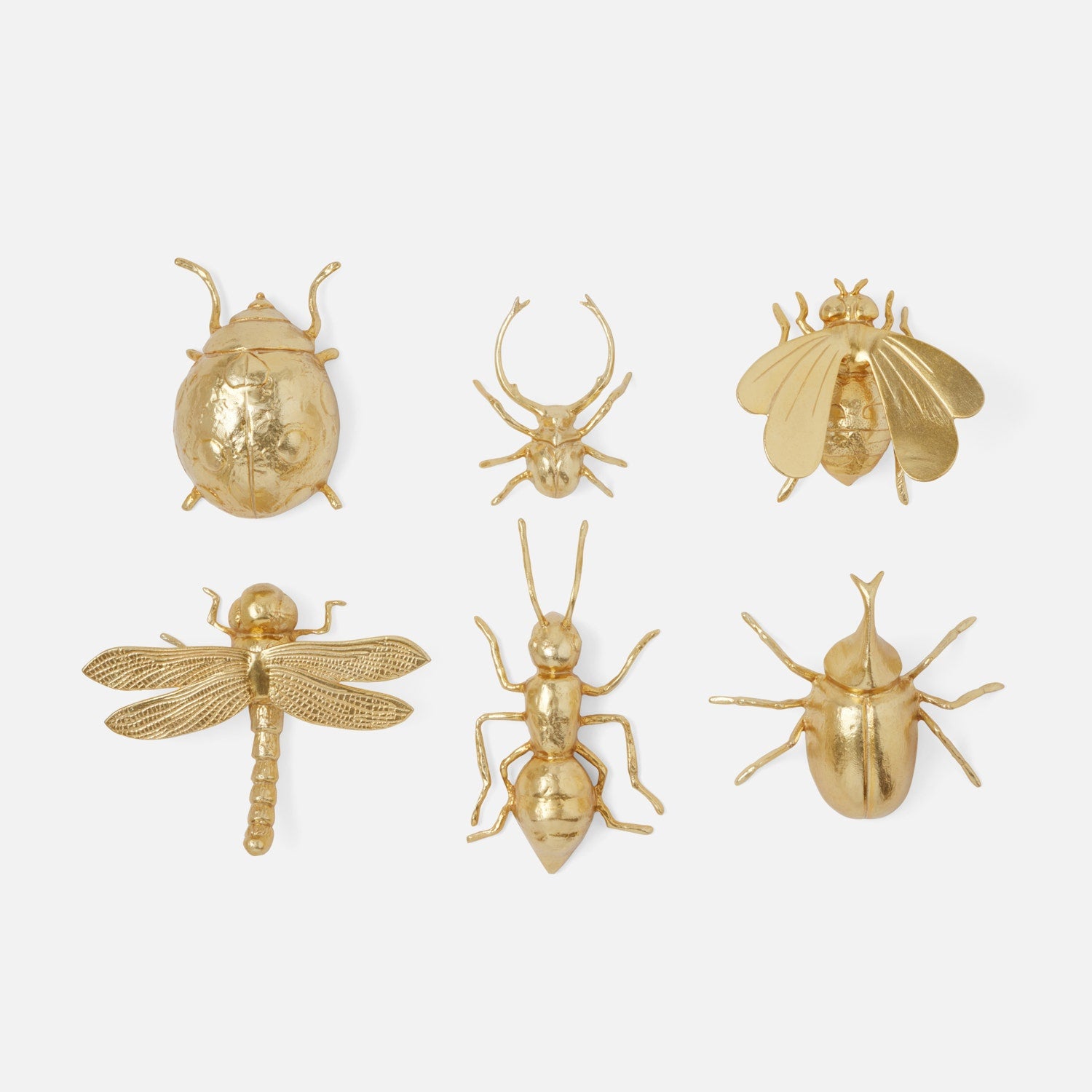 Add a touch of whimsical charm to any vignette with our Wisteria collection of six insects in shiny gold or antiqued silver. Each set includes an ant, a ladybug, a dragonfly, a bee, and two different beetles.